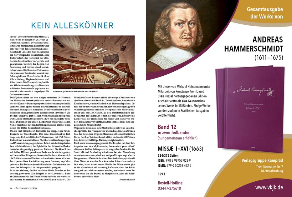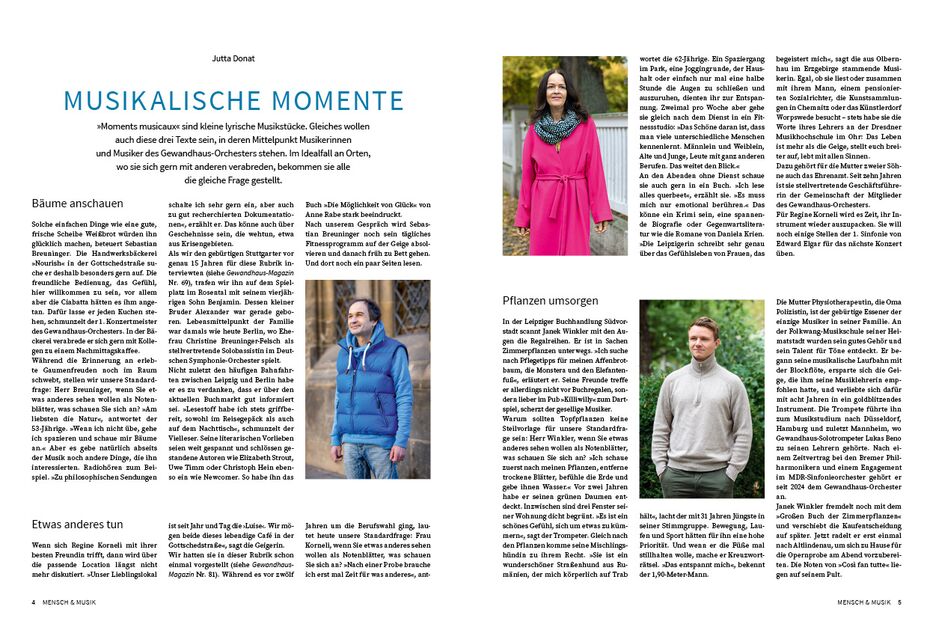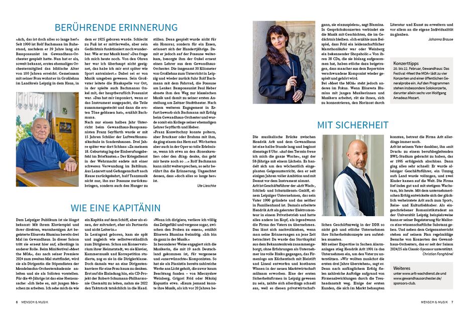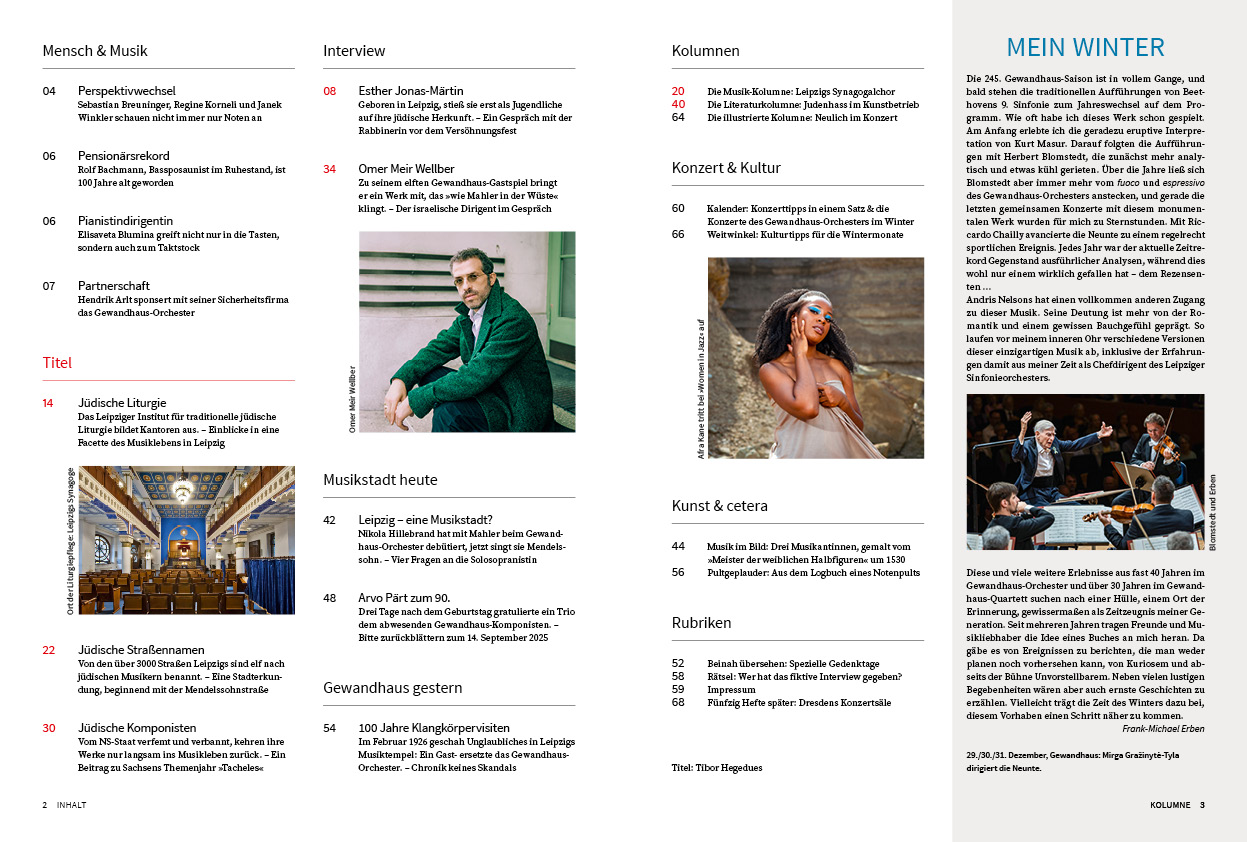 Viermal im Jahr erscheint das Gewandhaus-Magazin, die Leipziger Musikillustrierte. Das Gewandhaus-Magazin führt dem Leser die Geschichte der Musikstadt Leipzig in allen Facetten vor Augen, schreibt Berichtenswertes um und über das Gewandhausorchester, setzt sich mit zentralen Kultur-Themen Leipzigs und außerhalb auseinander, rezensiert Bücher und CDs und vieles mehr. Dabei will das Gewandhaus-Magazin heute wie gestern unser „Kulturbedürfnis“ wecken. Es will Interesse anregen, will informieren, konfrontieren und streiten - aber stets im besten Sinne für die Sache.
