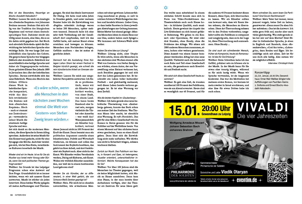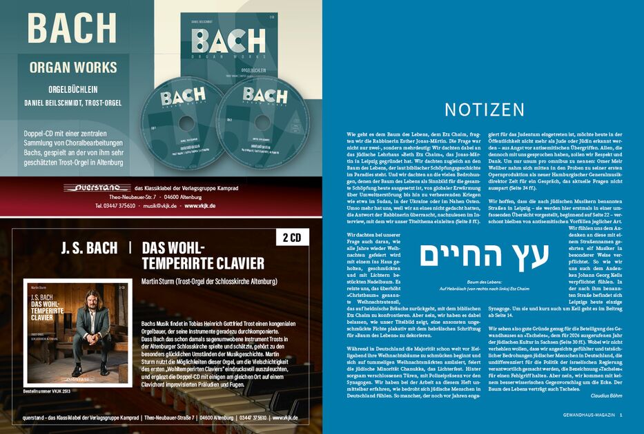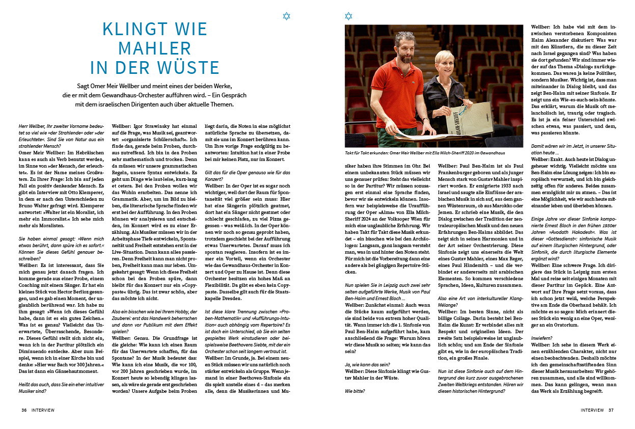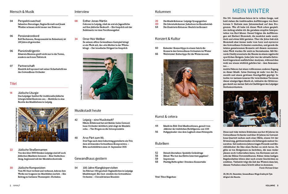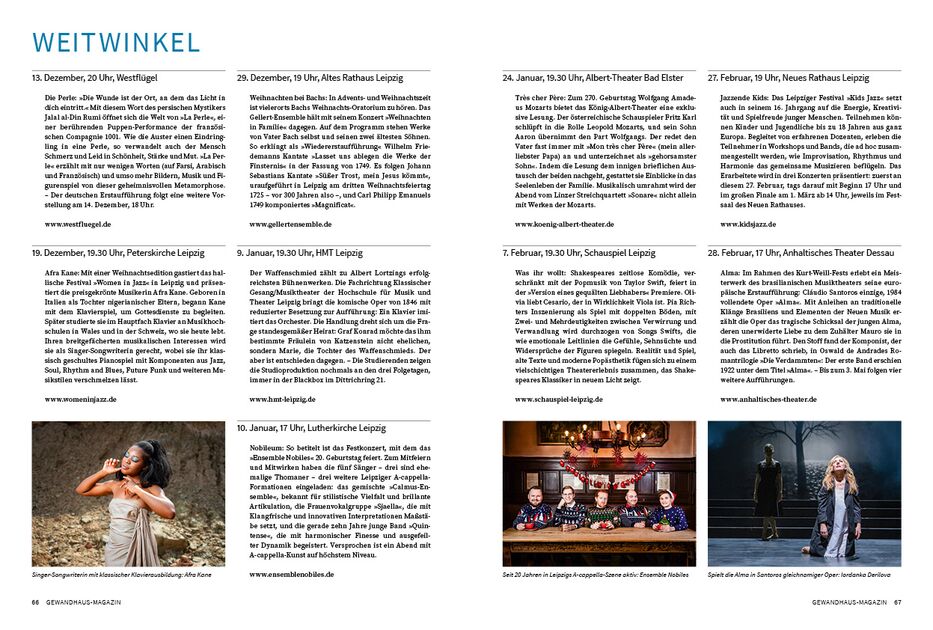 Viermal im Jahr erscheint das Gewandhaus-Magazin, die Leipziger Musikillustrierte. Das Gewandhaus-Magazin führt dem Leser die Geschichte der Musikstadt Leipzig in allen Facetten vor Augen, schreibt Berichtenswertes um und über das Gewandhausorchester, setzt sich mit zentralen Kultur-Themen Leipzigs und außerhalb auseinander, rezensiert Bücher und CDs und vieles mehr. Dabei will das Gewandhaus-Magazin heute wie gestern unser „Kulturbedürfnis“ wecken. Es will Interesse anregen, will informieren, konfrontieren und streiten - aber stets im besten Sinne für die Sache.